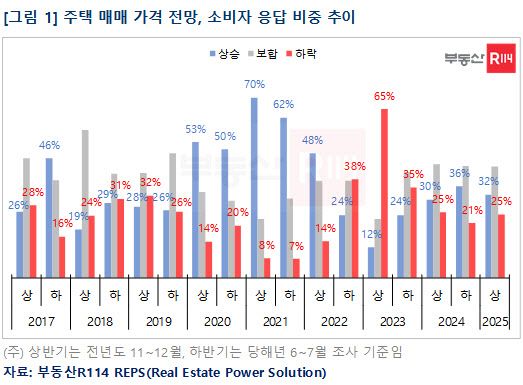 부동산R114가 6일부터 18일까지 전국 1306명을 대상으로 ‘2025년 상반기 주택 시장 전망’ 설문조사를 실시한 결과 전체 응답자의 32%가 집값이 상승할 것이라고 전망했다. 하락할 것이라는 응답은 25%였다. 부동산R114는 반년마다 해당 조사를 하는데 세 번 연속 상승 전망이 하락 전망을 상회한 것이다.