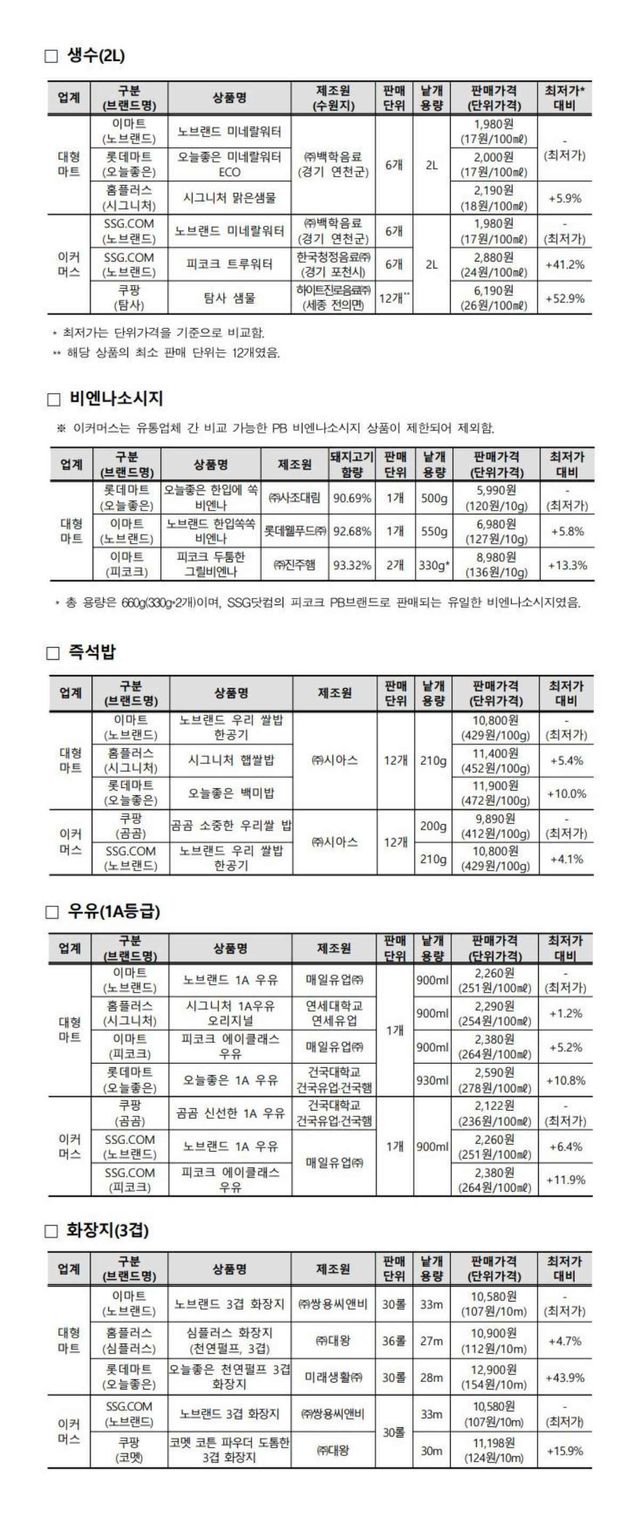 품목별 PB 상품 가격 비교표. / 한국소비자원 제공
