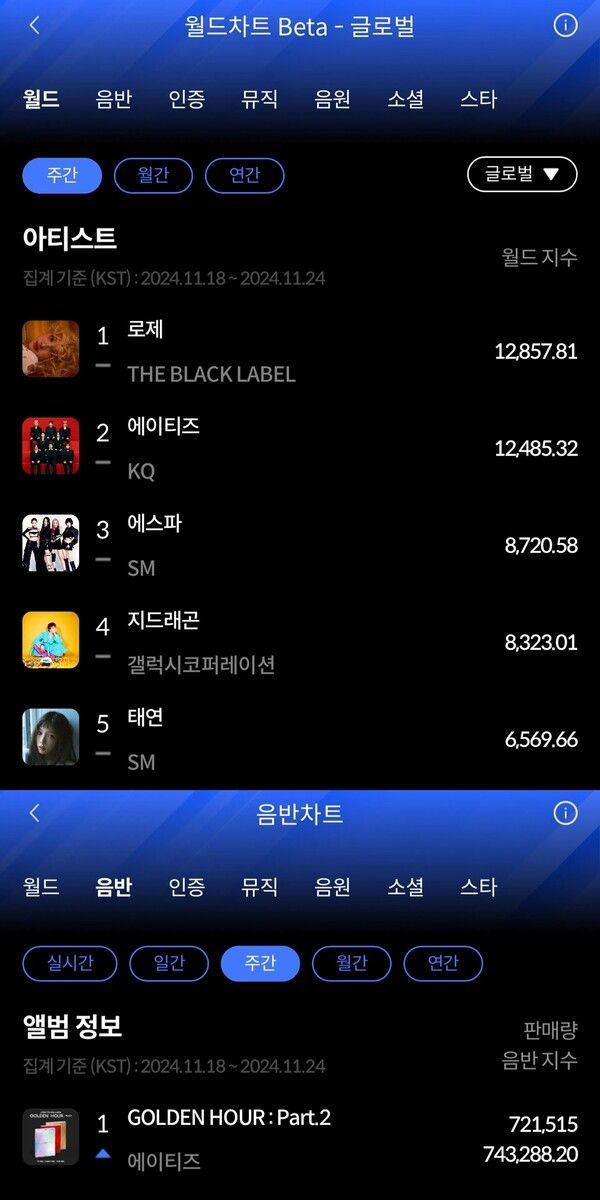 주간 월드차트에서는 로제가 독보적인 글로벌 인기를 과시했다. 로제는 소셜과 미디어 부문에서 높은 점수를 획득하며 1만2857.81점의 월드 지수로 1위를 점했다. 이어 에이티즈가 월드 지수 1만2485.32점으로 2위, 에스파가 월드 지수 8720.58점으로 3위에 자리했다.