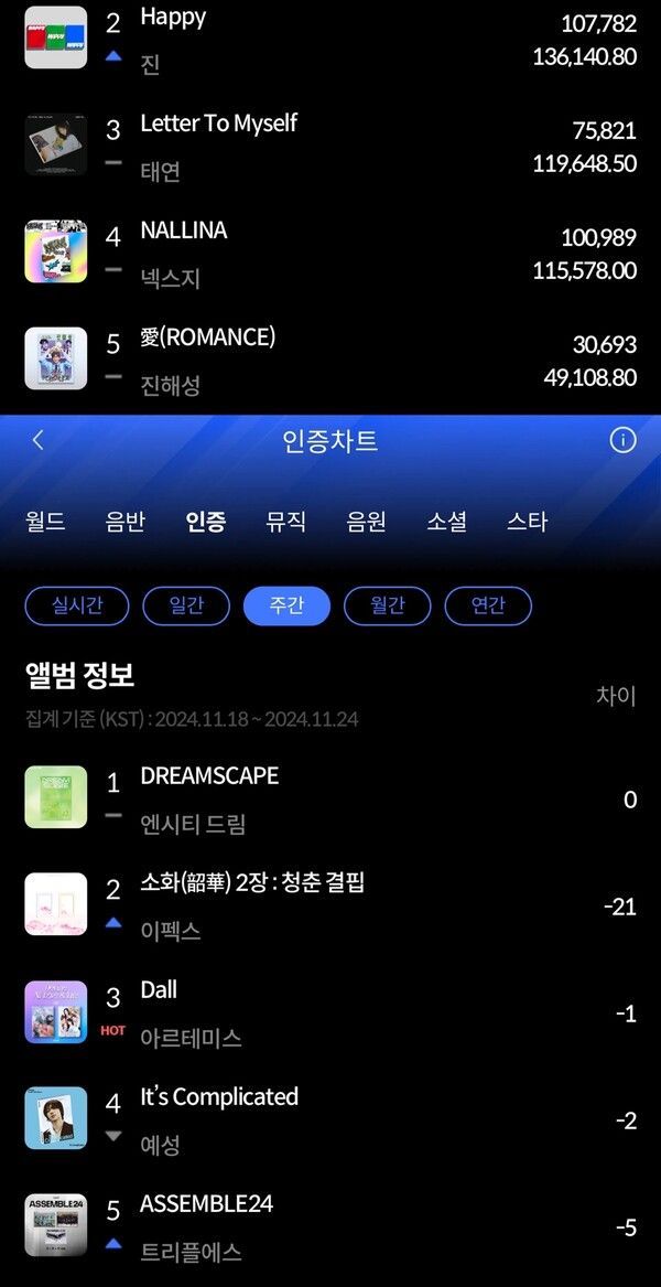 주간 인증차트에서는 엔시티 드림의 정규 4집 'DREAMSCAPE'가 1위를 차지했다. 엔시티 드림의 정규 4집 'DREAMSCAPE'는 지난 한 주 간 말레이시아 지역에서 가장 높은 인증률을 보였다. 2위는 이펙스 정규 2집 '소화(韶華) 2장 : 청춘 결핍', 3위는 아르테미스 정규 1집 'Dall'이다.