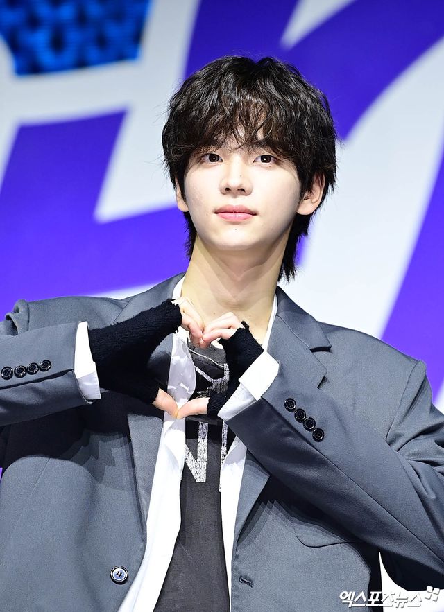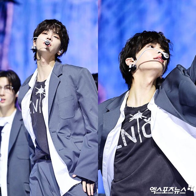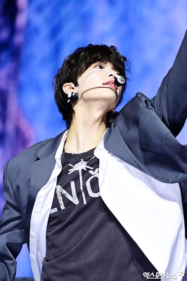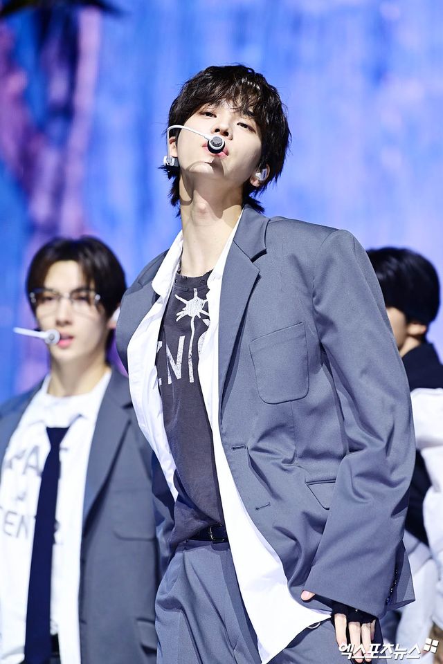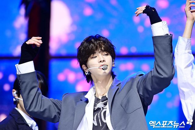 이날 쇼케이스에 참석한 투어스 신유가 무대를 선보이고 있다.