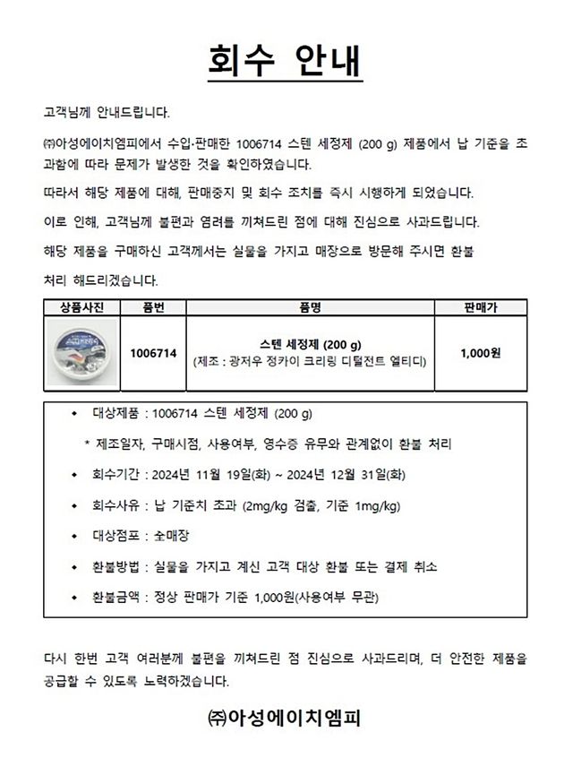 다이소 측은 공지에서 "아성에이치엠피에서 수입 및 판매한 '스텐 세정제'(200g) 제품에서 납 기준을 초과함에 따라 문제가 발생한 것을 확인했다. 따라서 해당 제품에 대해 판매중지 및 회수 조치를 즉시 시행하게 됐다"라고 밝혔다.