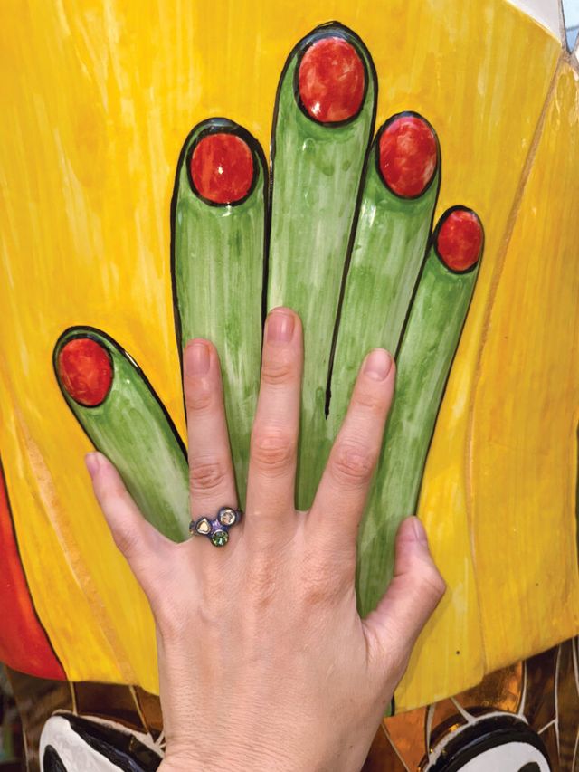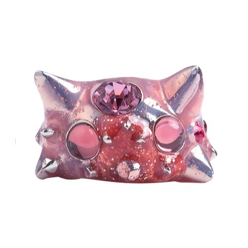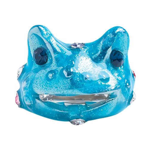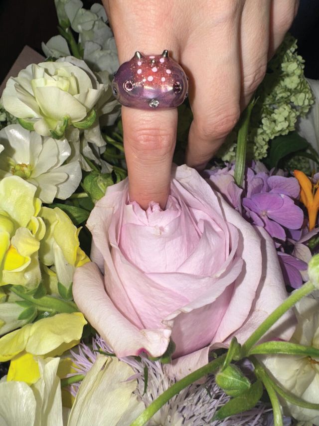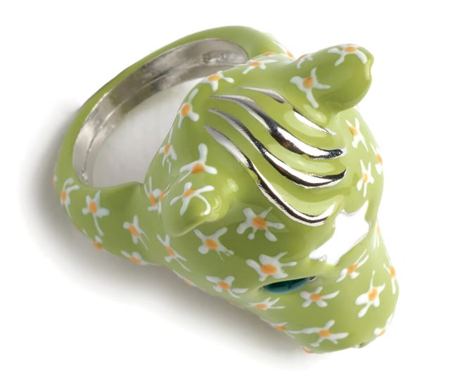 우리는 모든 아이템을 제작할 때 지속 가능성을 생각한다. 주얼리는 로드아일랜드의 소규모 공장과 협력해 생산하는데, 데드스톡 라인스톤과 빈티지 카보숑을 주로 사용한다. 모든 반지는 라인스톤을 소재로 하고, 각각의 반지 캐릭터 눈에는 빈티지 카보숑을 세팅해 완성한다. 개구리, 조랑말, 곰, 외계인, 돌고래 반지 등등 모두!