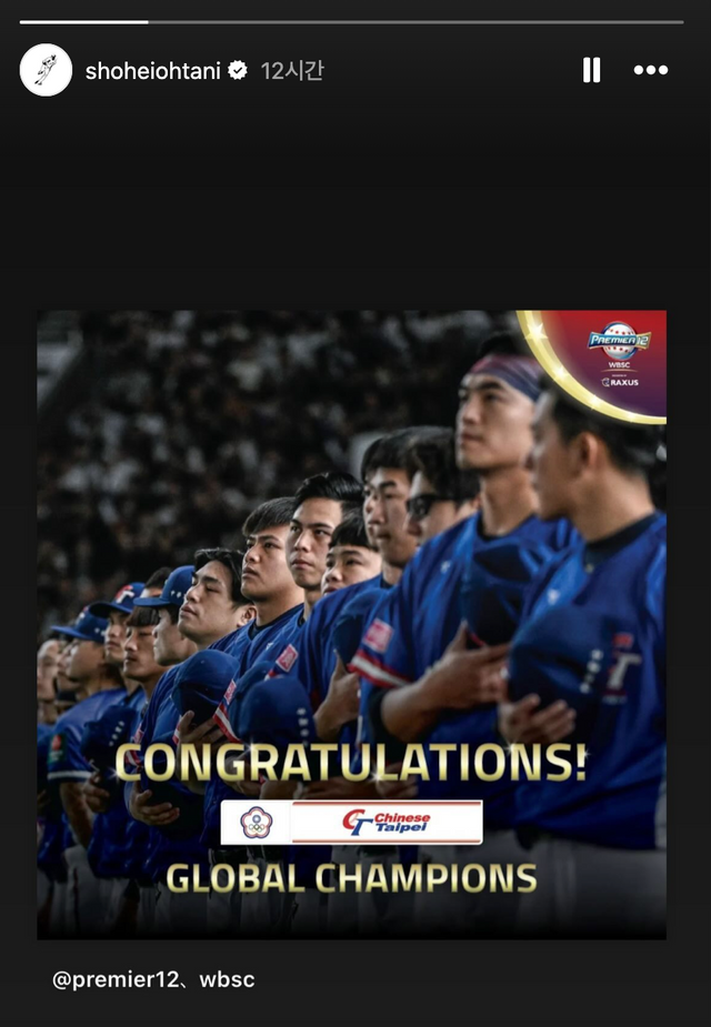 오타니는 자신의 인스타그램 스토리에 대만의 2024 세계야구소프트볼연맹(WBSC) 프리미어12 우승을 축하하는 프리미어12 공식 계정의 게시물을 인용, 프리미어12 첫 우승을 차지한 대만에 축하를 표했다.