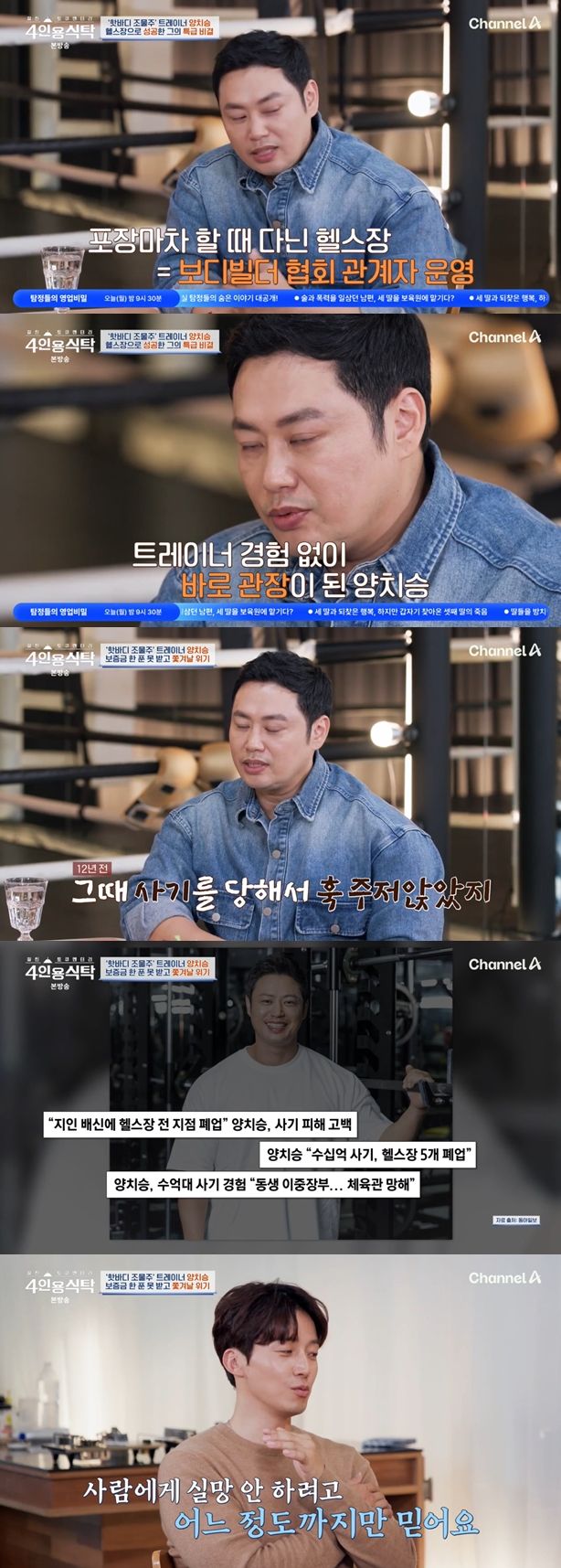 25일 방송된 채널A '4인용식탁'에는 스포츠 트레이너 겸 방송인 양치승이 출연해 배우 최강희, 성훈, 개그맨 허경환을 초대했다.