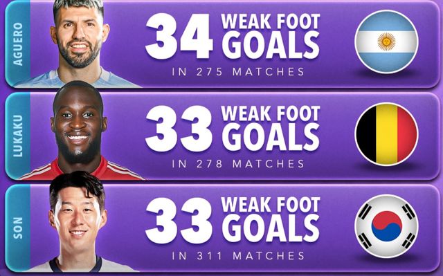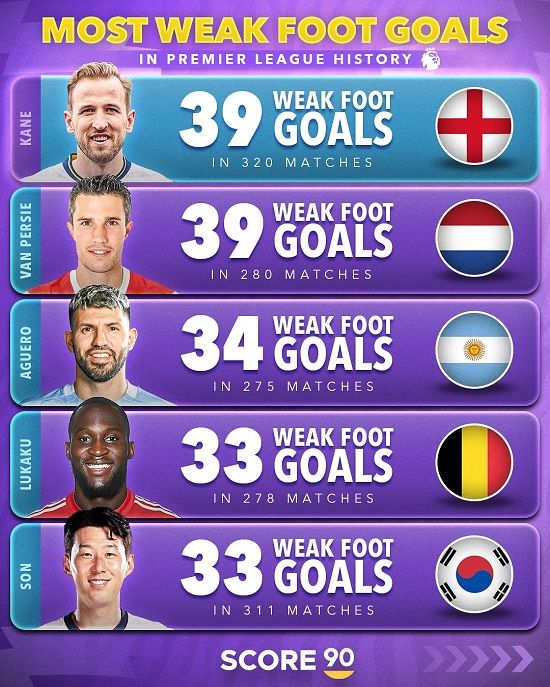 지난해 1월 프리미어리그는 약한 발로 골을 터뜨린 선수 순위에서 케인과 손흥민을 공동 1위로 조명했다. 당시 손흥민은 왼발로만 40골을 터뜨려 케인과 어깨를 나란히 한 바 있다.
