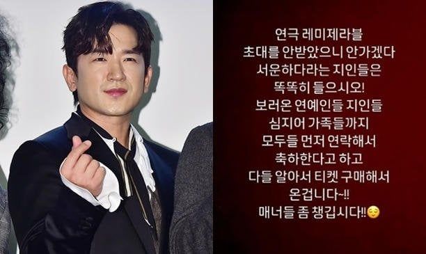 이민우는 25일 자신의 SNS에 "'연극 '레미제라블' 초대를 안 받았으니 안 가겠다' '서운하다'라는 지인들은 똑똑히 들으시오"라고 운을 뗐다.