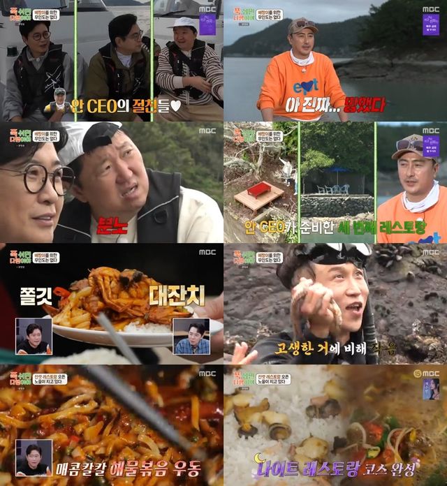 선셋 레스토랑의 오픈을 기념하며 안 CEO가 오랜만에 셰프로 변신했다. 거북손, 소라, 박하지를 이용해 해물덮밥 요리에 나선 것. 안 CEO는 “집에서 맨날 (요리)해. 주방만 바뀐 것뿐이야”라며 요리에 대한 남다른 자신감을 표현했다. 안 CEO는 마늘과 파로 기름을 우린 뒤 해산물을 가득 넣고 중화풍으로 조리한 해물덮밥을 완성했다. 정형돈, 김용만, 김성주는 해물덮밥을 먹고 노동의 분노는 깨끗이 잊은 듯 안 CEO의 요리 실력을 칭찬했다.
