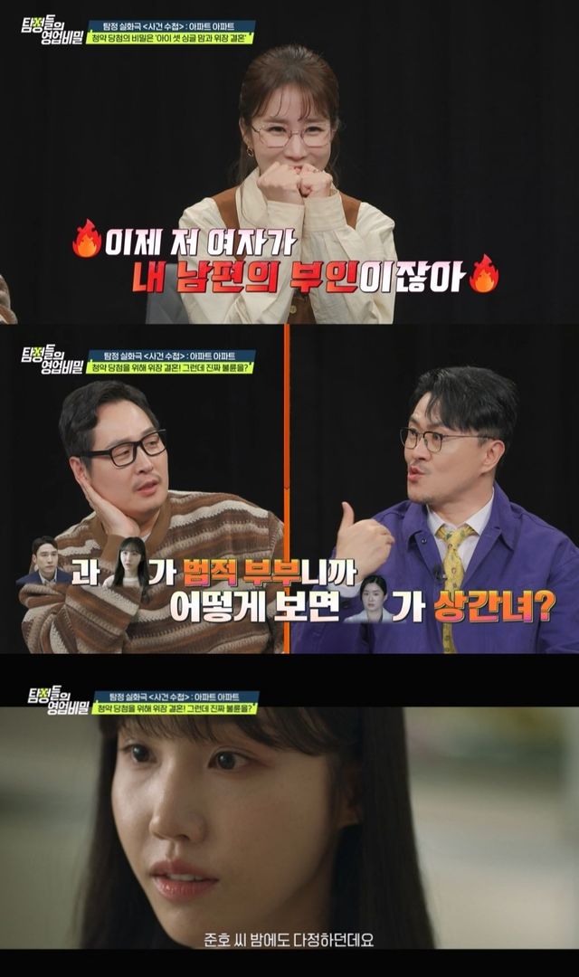 이날 실화 사연의 의뢰인은 추첨제 청약 당첨을 위해 혼인 신고를 미루고 아이 없이 남편과 '딩크'로 살고 있었다. 그러나 아내는 남편의 불륜을 의심했고, 탐정은 의문의 여성과 서로 다정하게 음식을 먹여주는 남편을 포착했다. 알고 보니 해당 여성은 부동산에서 소개한 '청약 당첨용 가짜 부인'이었다.