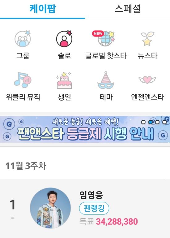 최근 '팬앤스타'에 따르면, 임영웅은 11월 3주 차 솔로가수 인기 랭킹 투표에서 1위에 등극했다.