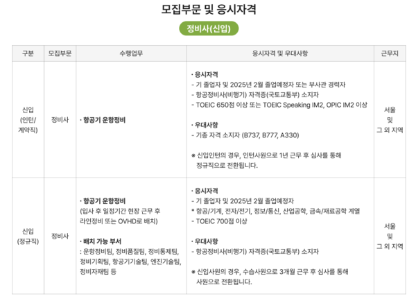 정비사는 인턴, 신입 및 경력사원을 공개 채용한다. 인턴 정비사의 경우 국토교통부 항공정비사 자격증을 보유하면 응시 가능하다. 신입사원의 경우 이공계열 전공의 기 졸업자 및 2025년 2월 졸업 예정자면 응시할 수 있다.