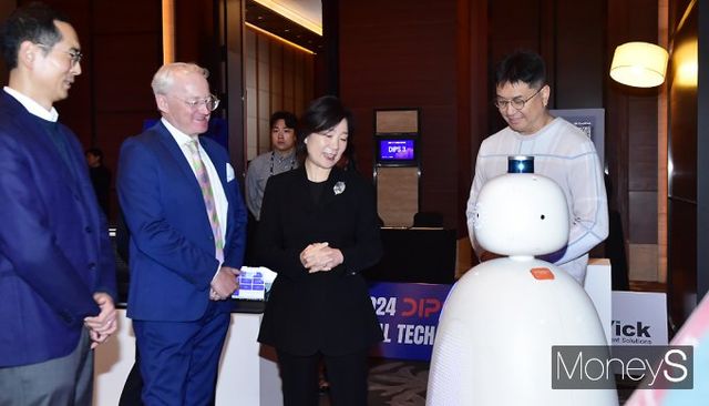 오영주 장관 및 토비 월시 호주 뉴사우스웨일스대학교 교수 등이 26일 서울 영등포구 여의도동 콘래드 서울에서 진행된 '2024 초격차 글로벌 테크 콘퍼런스(2024 DIPS GLOBAL TECH CON)'에 참석, 초격차 스타트업 우수 기술 체험공간에서 설명을 듣고 있다.