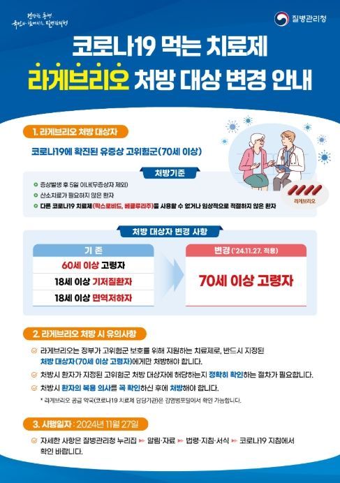 [와이뉴스] 정부가 공급 중인 코로나19 치료제인 라게브리오의 처방 기준 연령이 11월 27일부터 기존 60세에서 70세로 상향 조정될 예정이다.