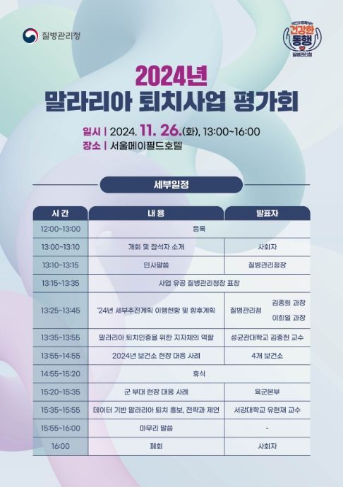 [와이뉴스] 질병관리청은 11월 26일, 서울 메이필드호텔에서 말라리아 퇴치사업 참여 지자체 담당자 및 관련 전문가 등 150여 명이 참석한 '2024년 말라리아 퇴치사업 평가회'를 개최한다고 밝혔다.