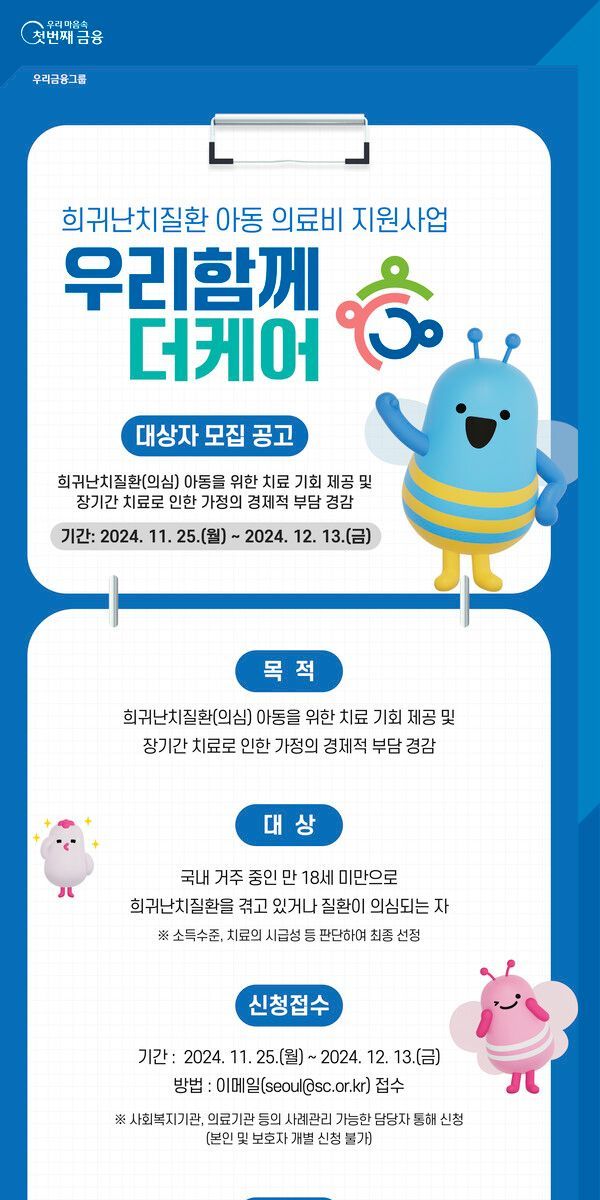 우리금융미래재단과 세이브더칠드런은 소득수준, 치료의 시급성 등을 종합적으로 고려해 지원 대상자를 선정할 예정이다. 지난해 진행된 “우리 함께 더 케어 시즌1”에서는 80명의 아동에게 총 6억원을 지원한바 있다.