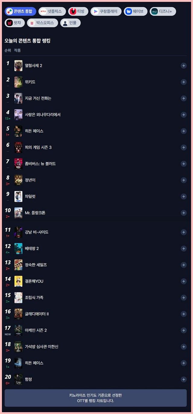 11월 26일자 키노라이츠 랭킹 차트 '오늘의 콘텐츠 통합 랭킹'. / 키노라이츠 제공