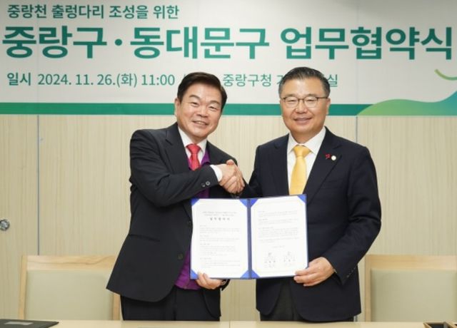 이날 오전 중랑구청 기획상황실에서 진행된 협약식에는 이필형 동대문구청장과 류경기 중랑구청장을 비롯해 양쪽 구 관계자 10여 명이 참석했다.
