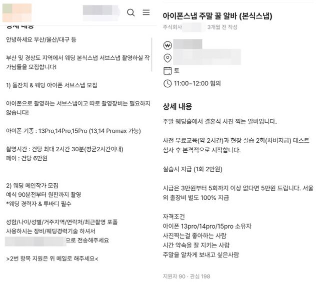 하지만 아이폰 웨딩 스냅 알바는 여전히 횡행하고 있다. 실제 포털사이트 검색을 통해서 아이폰 스냅 알바를 구하는 모집공고를 쉽게 확인할 수 있었다. 한 모집공고를 보면 ‘주말 꿀(쉬운) 알바’라고 소개하며 아이폰 소지자는 약 2시간의 사전 교육과 2회의 현장 실습 후 테스트에 통과하면 바로 현장에 투입될 수 있다고 소개하고 있었다. 업계에 정통한 한 관계자는 “교육도 PPT 띄워놓고 1시간 정도 읽어주는 것이다. 그런 교육으로 비전문가가 전문가처럼 사진을 찍는 것은 불가능”이라며 “그렇게 알바에게 한 건당 5만원의 급여를 주고 나머지는 업체가 챙기는 것”이라고 설명했다. 최근 논란이 됐던 업체를 이용했던 김모(31)씨는 “전문 사진작가 같은 느낌은 전혀 없었고 사진도 이상하게 찍어 속상했던 경험이 있다”며 “전혀 전문성이 느껴지지 않았고 친구들 중에서도 사진을 못 찍는 친구들이 찍어준 느낌”이라고 토로했다.