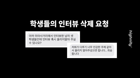 길거리에서 학생들에게 ‘동덕여대 시위’를 주제로 인터뷰를 요청하면, 돌아오는 대답은 대개 부정적이다. 이데일리 1318 뉴스 채널 하이니티는 11일부터 18일까지 총 16명의 고등학생과 인터뷰했다. 하지만 촬영물을 게재할 수 없었다. 학생들이 영상 공개를 뒤늦게 거절했기 때문이다. 왜 이 학생들은 인터뷰를 하고 나서 영상 게재는 거부했을까?