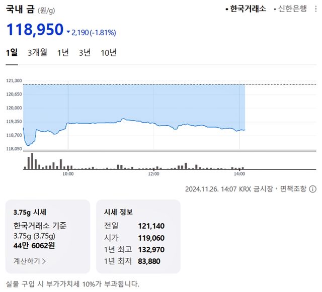 국내 금시세(금값)가 26일 오후 하락세(전 거래일 대비)를 보이고 있다.