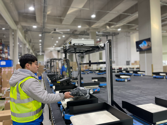 CJ대한통운 직원이 미니 AGV(무인 운반 차량)를 운용하고 있는 모습. ⓒ CJ대한통운 제공