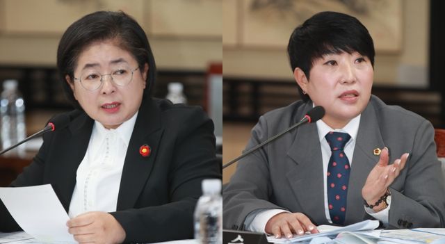 26일 제주도의회 예산결산특별위원회의 내년도 제주도 예산안 심사에서 김경미, 홍인숙 의원이 질의하고 있다. 제주도의회 제공