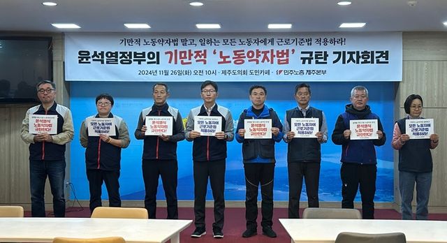 민주노총 제주본부는 26일 제주도의회 도민카페에서 기자회견을 열고 "일하는 모든 노동자에게 근로기준법을 적용해야 한다"면서 "노동약자 지대를 공고히 하겠다는 기만적인 윤석열 정부를 규탄한다"고 밝혔다.