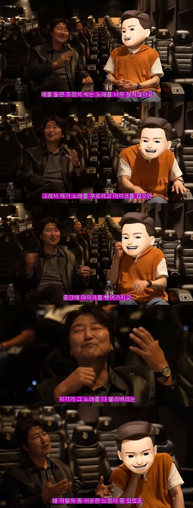 평상시에 노래하는 걸 좋아하냐는 질문에 송강호는 "듣는 걸 좋아한다. 예를 들면 조정석 씨는 노래를 너무 잘한다. 근데 노래를 잘하는데 남이 노래를 부르는 거를 못 봐준다"며 조정석과의 비화를 공개했다.