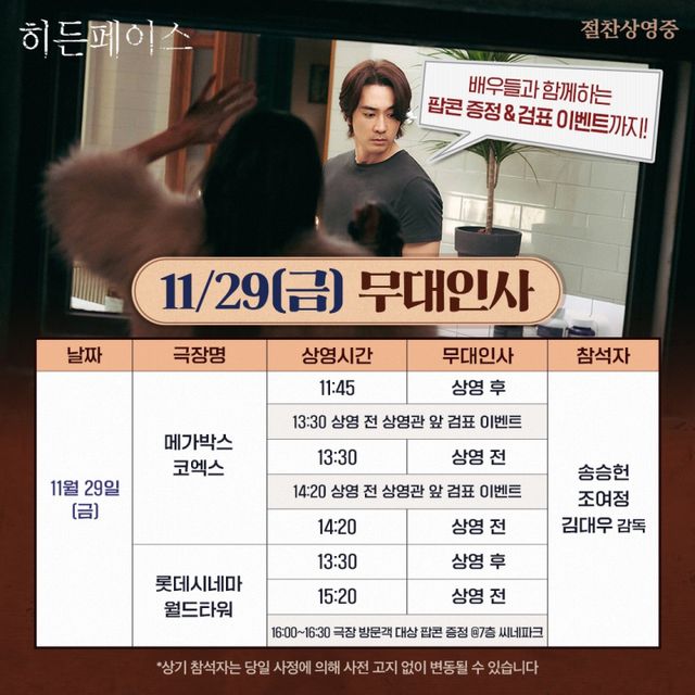흥행 열기 속 열띤 홍보를 이어가고 있는 ‘히든페이스’의 평일 낮 무대인사와 관련된 사항은 극장별 홈페이지 및 애플리케이션에서 확인할 수 있다. 극장 절찬 상영중.