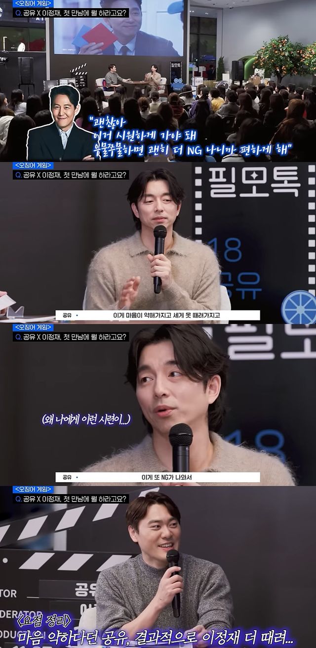 (엑스포츠뉴스 이유림 기자) 배우 공유가 '오징어게임'을 촬영하며 이정재의 뺨을 여러 번 때렸다고 사과했다.