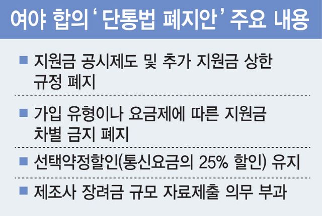 단통법 폐지 후 이용자 보호를 위한 조항으로는 거주 지역이나 나이 또는 신체적 조건 등의 사유로 부당하게 차별적인 지원금을 지급하지 못하도록 하는 내용을 포함했다. 당초 야당이 주장한 가입 유형(번호이동, 신규가입, 기기변경 등)이나 요금제에 따른 지원금 차별 금지는 여야 합의 과정에서 배제됐다. 이 내용이 들어가면 단통법 폐지 취지가 무색해진다는 지적을 야당이 수용해서다.