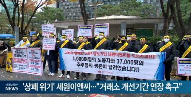 세원이앤씨 주주연대는 오늘(26일) 서울 여의도 한국거래소 앞에서 상장폐지 반대 집회를 열었습니다.