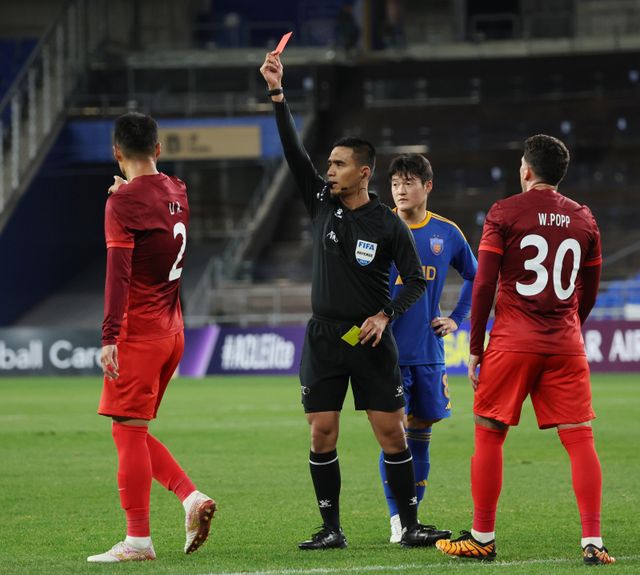 울산은 공격에 무게를 실었다. 전반 27분 고승범이 쇄도하면서 때린 슈팅이 골대 옆으로 빗나갔다. 전반 29분 이청용이 페널티 박스 안으로 드리블하는 과정에서 상대 리앙이 잡아끌었다. 애초 주심은 리앙에게 옐로카드를 꺼냈지만, 비디오판독(VAR) 후 색깔을 빨간색으로 바꿨다. 울산은 이때부터 수적 우위를 점하고 싸웠다.