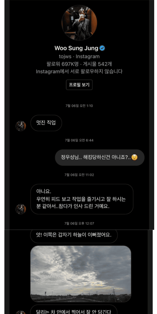 공개된 사진에 의하면 정우성의 인스타그램 아이디가 박혀있었다. 정우성은 DM으로 누리꾼 A씨에게 "멋진 직업"이라며 말을 걸었고, 이에 "해킹당하신 건 아니죠?"라고 답했다. A씨의 물음에 "아니요. 우연히 피드 보고 작업을 즐기시고 잘하시는 분 같아서…. 참다가 인사드린 것"이라고 설명했다.