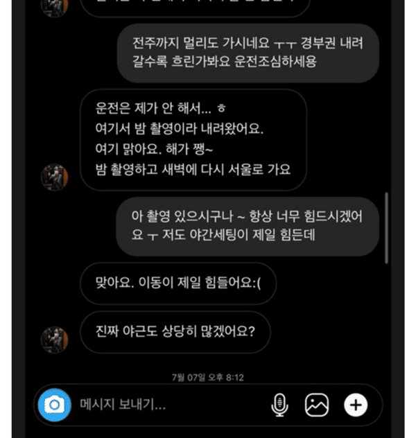 이에 상대방은 "촬영 있으시구나 항상 너무 힘드시겠어요. 저도 야간 세팅이 제일 힘든데"라고 답했고, 정우성은 "맞아요. 이동이 제일 힘들어요. 진짜 야근도 상당히 많겠어요"라며 연락을 계속 이어갔다.