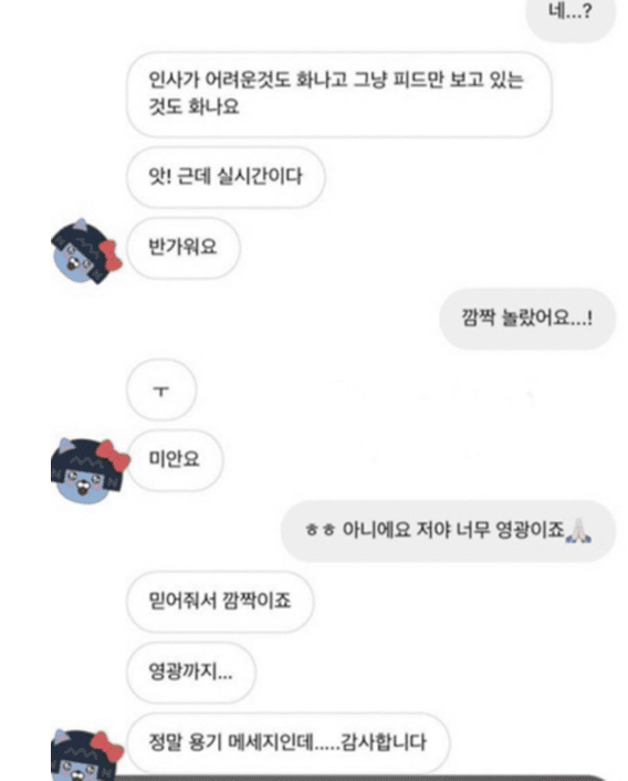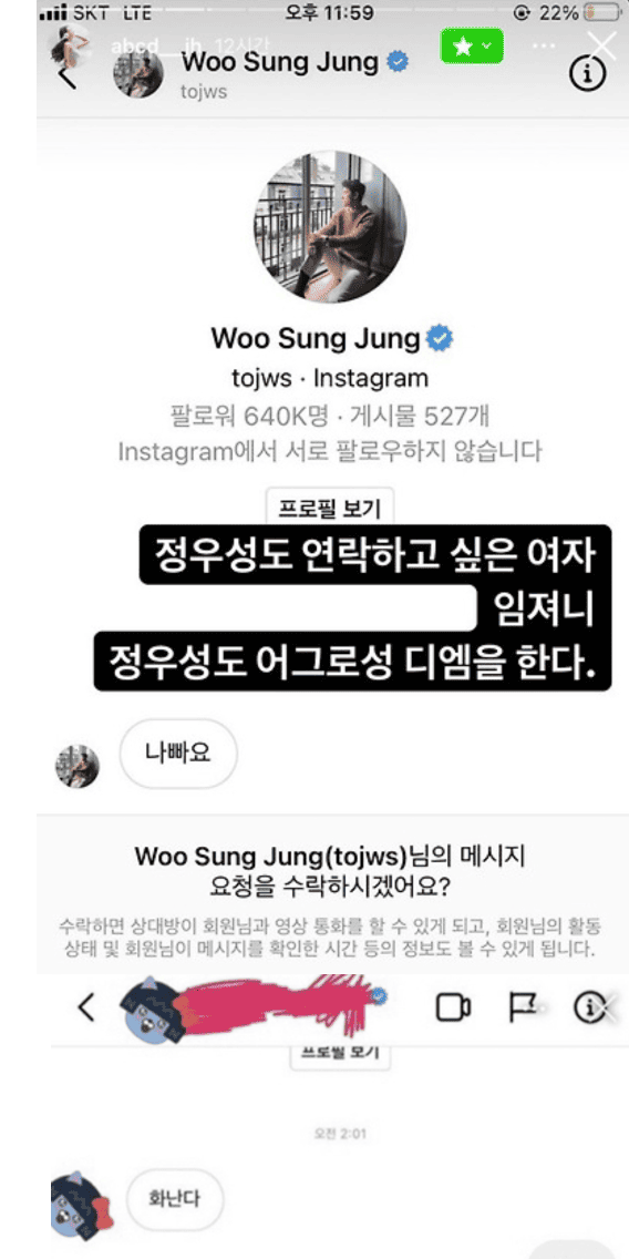 여기서 끝이 아니다. 또 다른 여성과 인스타그램 DM에서 그는 다짜고짜 "화난다"라고 말했어 이에 상대방은 "네?"라고 놀라했다. 정우성은 "인사가 어려운 것도 화나고 그냥 피드만 보고 있는 것도 화나요"라며 "앗 근데 실시간이네요 반가워요"라고 말했다. 정우성의 갑작스런 DM에 깜짝 놀랐다고 답한 여성은 곧 "영광이다"라고 말하자 "믿어줘서 깜짝이요 영광까지.. 정말 용기낸 메세지인데 감사합니다"라고 답했다.