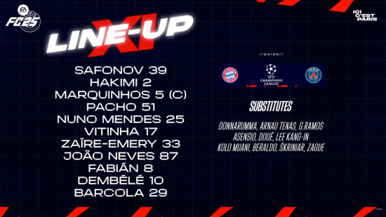 원정팀 PSG는 4-3-3 전형으로 맞섰다. 마트베이 사포노프 골키퍼가 장갑을 꼈고 누누 멘데스, 윌리안 파쵸, 마르퀴뇨스, 아슈라프 하키미가 수비를 구성했다. 중원은 주앙 네베스, 비티냐, 파비안 루이스가 지켰다. 최전방에 브래들리 바르콜라, 우스망 뎀벨레, 워렌 자이르-에메리가 나와 득점을 노렸다. 이강인은 벤치에서 기다렸다.