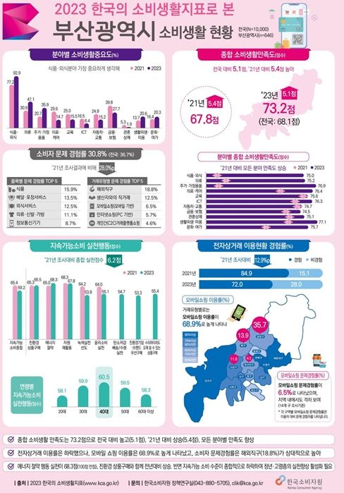 조사 결과, 2023년 부산시민(646명)이 체감한 종합 소비생활 만족도는 73.2점으로, 전국 68.1점 대비 5.1점 높아 전국 최고점으로 나타났으며 2021년 67.8점에서 5.4점 상승했다.