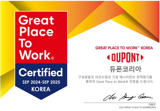 한국 듀폰의 양승관 대표는 “듀폰은 강력한 핵심가치를 바탕으로 직원들이 상호 존중하고, 안전한 환경에서 일할 수 있도록 많은 지원을 하고 있다”며, “이번 ‘일하기 좋은 기업’ 인증을 통해 직원들이 회사에 대한 자부심을 느끼기 바라며, 앞으로도 모든 직원들이 일과 삶의 균형을 유지하며 즐겁게 일할 수 있는 조직문화를 만들어 나가겠다”고 말했다.