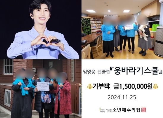 임영웅 팬클럽 '잠실웅바라기스쿨'은 지난 25일 송파구 '소년예수의집'에 방문해 150만 원의 정기 후원금과 30만 원 상당의 과일 박스를 전달했다고 밝혔다. 이번 기부는 이들의 14번째 기부로, 후원금과 물품 포함 총기부 금액은 180만 원이다.