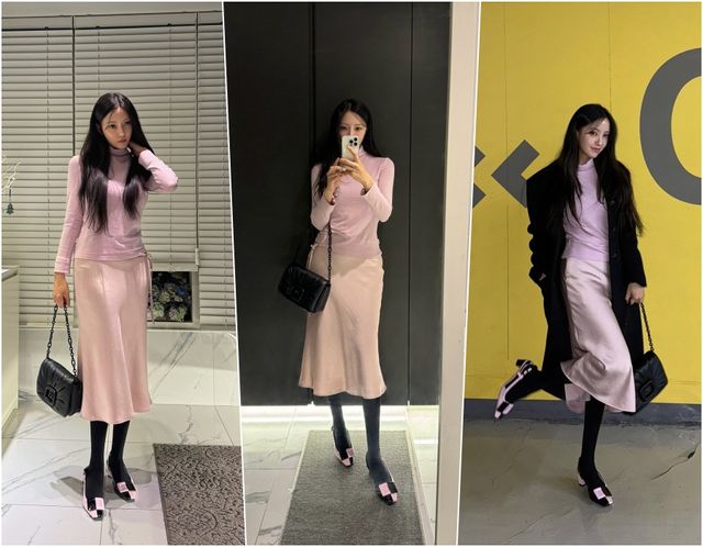 사진 속 효민은 검정과 연분홍이 체크 패턴을 이루는 구두를 신고 있는 모습이다. 효민은 신발에 맞춰 의상도 톤을 다르게 한 연분홍빛 니트와 스커트를 매치한 뒤, 검정색의 코트와 가방, 스타킹을 매치해 '블랙핑크 패션'을 완성했다.