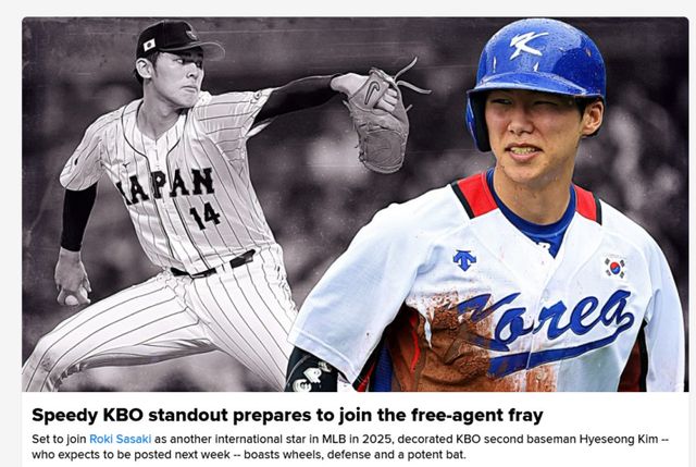 MLB닷컴은 포스팅(비공개 경쟁입찰) 신청을 예고한 김혜성의 소식을 전했다. 일본인 투수 사사키 로키와 양면 분할 한 편에 국가대표팀 유니폼을 입는 모습을 담은 사진으로 섬네일을 장식했다. 사사키는 흑백, 김혜성은 컬러인 게 독특하다.