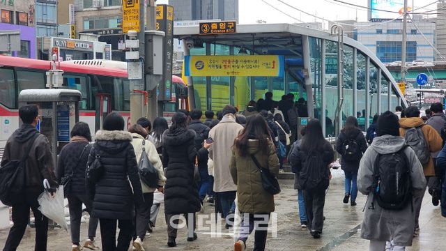 같은 시각 사당역 인근의 상황도 비슷했다. 길이 미끄러운 탓에 시민들은 종종걸음으로 지하철역과 버스 정류장으로 급하게 향했다. 눈이 조금씩 녹아 물기와 살얼음으로 축축한 인도 위를 시민들이 급하게 뛰어가면서 아슬아슬한 상황도 연출됐다. 사당역 안에서 시니어승강기안전단으로 일하는 정모(77)씨는 “한 번에 300여 명이 역 안으로 밀려 내려오는데 다들 걸어내려 오거나 뛰어오니까 미끄러지는 경우가 많다”고 말했다. 30대 직장인인 주모씨도 “평소보다 지하철 대기 줄이 거의 2배 가까이 길어진 거 같다”고 전했다.