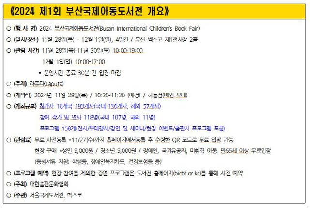 문화체육관광부와 부산시 후원으로 대한출판문화협회(출협)가 주최하는 ‘2024 제1회 부산국제아동도서전’이 이날부터 12월 1일까지 나흘간 벡스코 제1전시장 2홀에서 열린다.