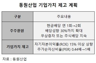 동원산업은 연 1회 실시하던 현금 배당을 내년부터 반기 배당을 신설해 연 2회 지급하고, 지난해 17.6%였던 배당성향을 30%까지 점진적으로 확대해 나갈 계획이다.
