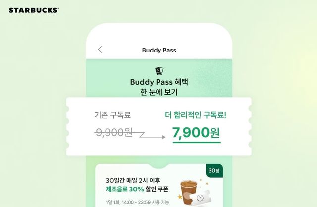버디 패스는 매일 오후 2시 이후 사용할 수 있는 제조 음료 30% 할인 쿠폰, 푸드 30% 할인, 딜리버스 배달비 무료, 온라인스토어 배송비 무료 쿠폰 등으로 구성된 스타벅스 최초의 구독 서비스다. 이 서비스는 스타벅스를 자주 방문하는 고객에게 실질적인 혜택을 제공하기 위해 기획됐다.