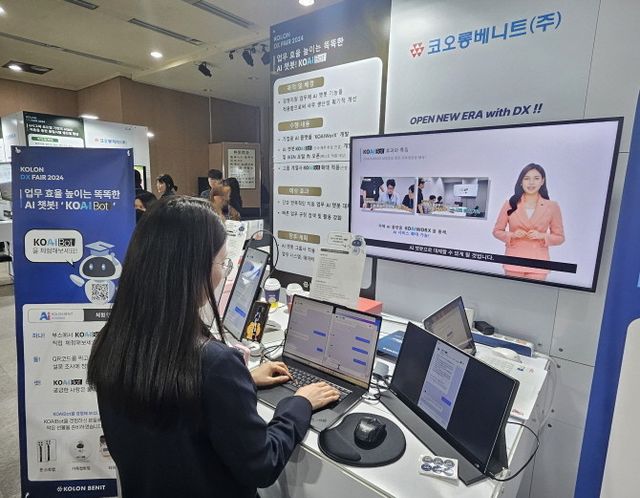 코오롱베니트 직원이 '코오롱 DX 페어 2024'에서 자사 AI 챗봇 서비스 코아이봇(KOAIBot)을 시연하고 있다. ⓒ 코오롱그룹