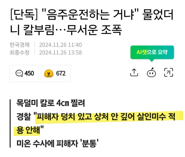 모가지에 칼침을 맞아도 덩치가 크면 살인미수가 아님