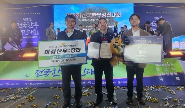 서귀포시축협 조합원 김재종씨가 농림축산식품부 주최로 26일 농협안성팜랜드에서 열린 '제21회 전국한우경진대회'에서 미경산우 부문 장려상을 수상했다. 서귀포시축협 제공