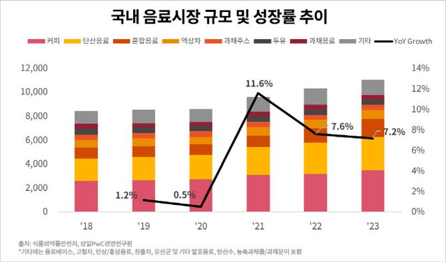 특히 팬데믹 이후엔 건강·기능성 음료 시장이 커지고 배달 증가에 따라 시장이 성장하며 2021년 전년 대비 성장률 11.6%를 기록한 뒤 꾸준히 7%대 성장률을 유지하고 있다.